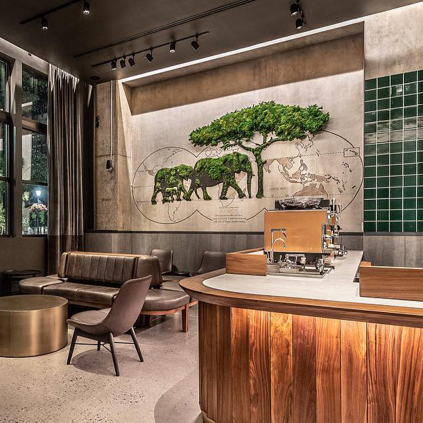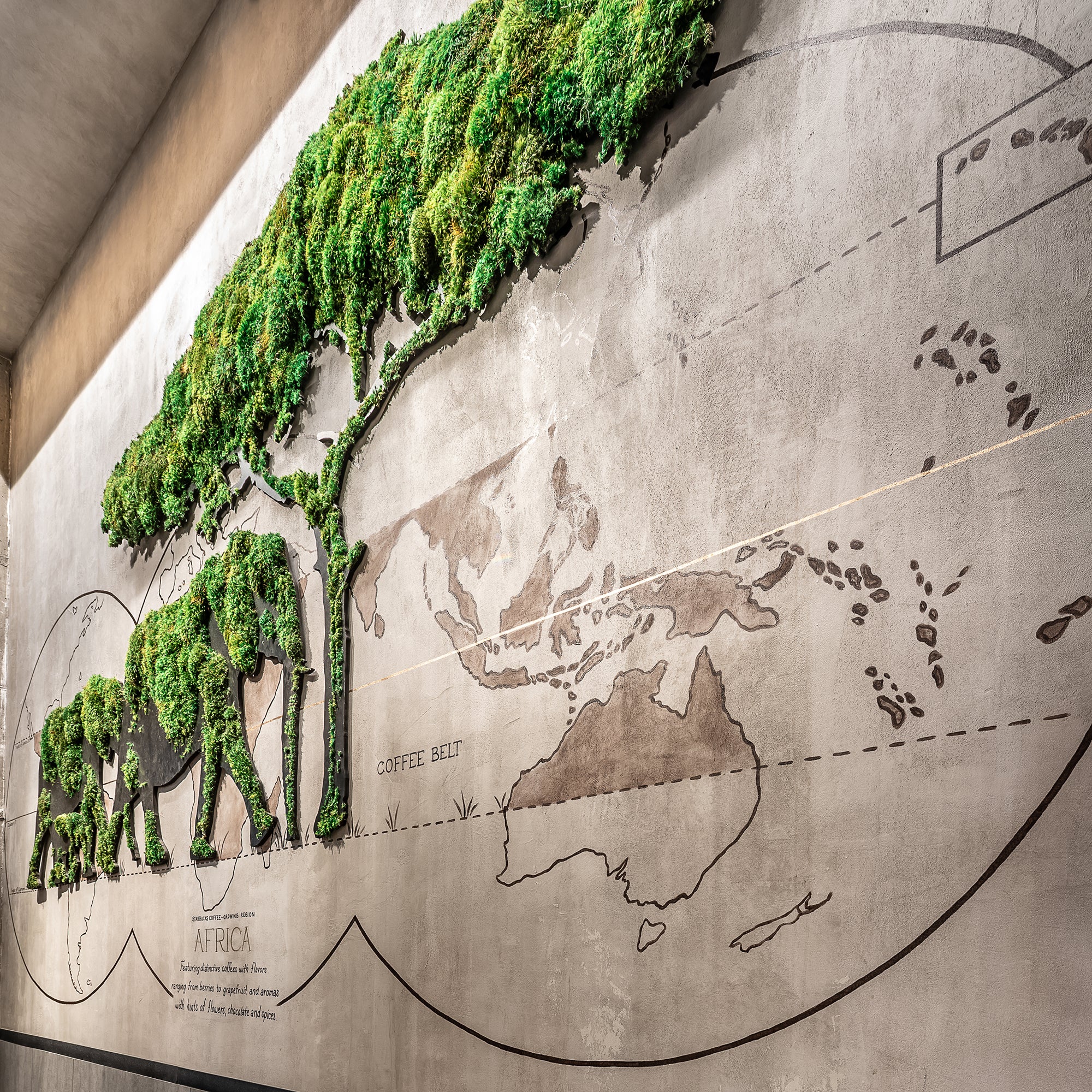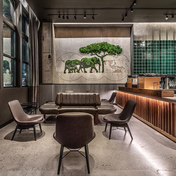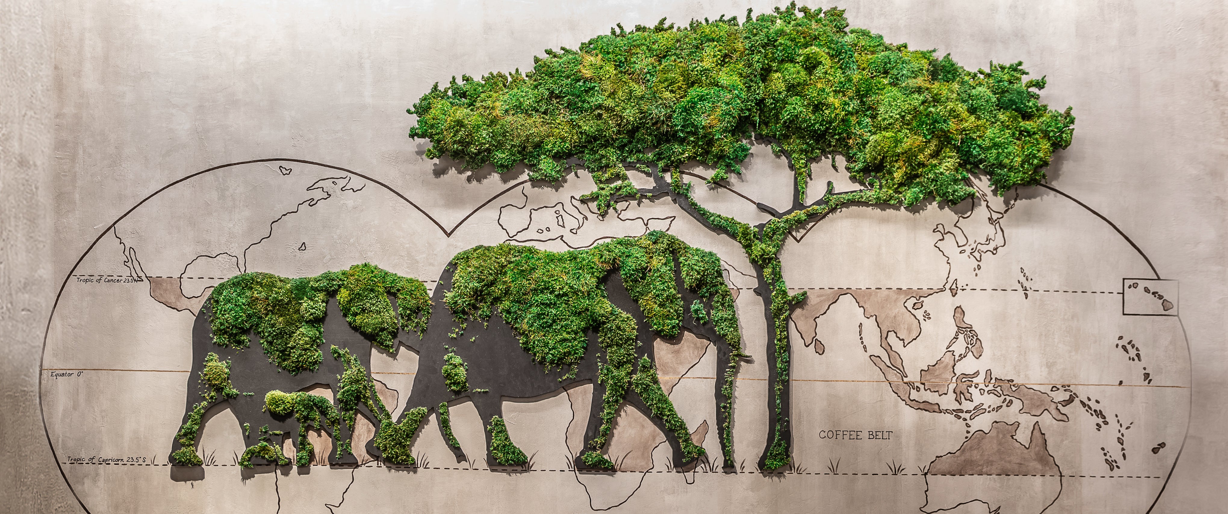 Plant The Future designed custom moss artwork for Starbuck in Bethesda, Maryland. The African Elephants represent Leadership and Wisdom in the animal kingdom, walking through the coffee belt region of Kenya.