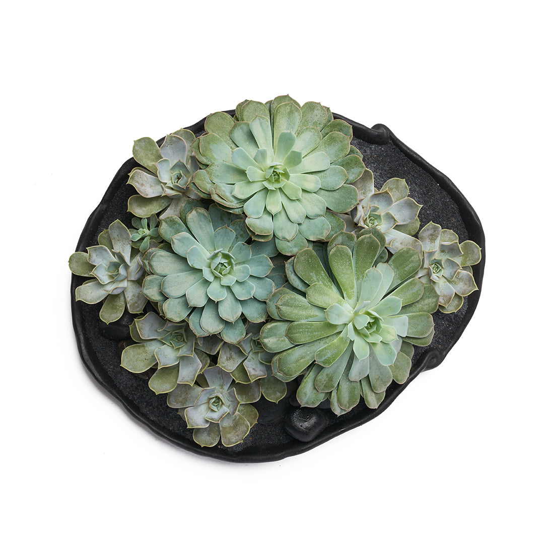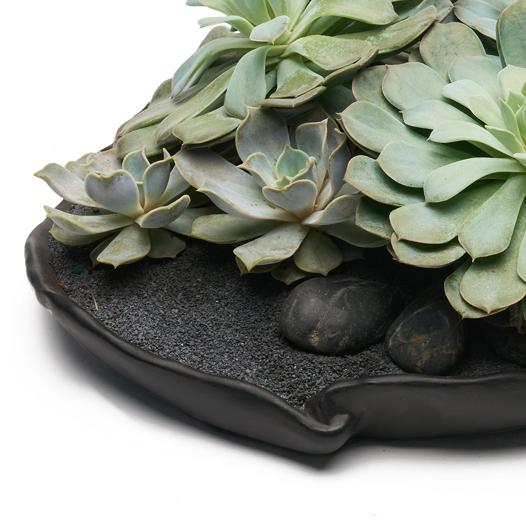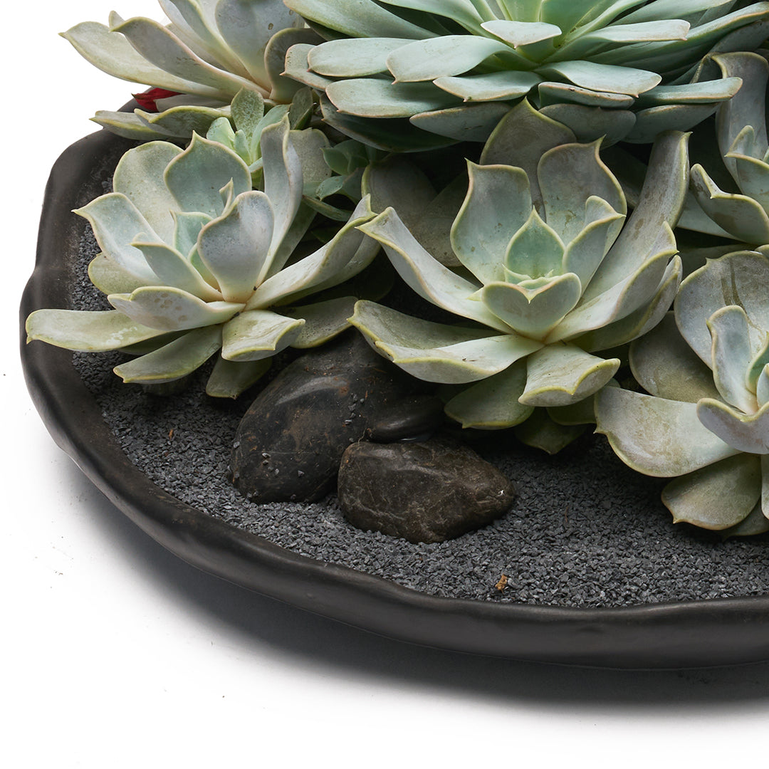 This succulent garden features a variety of Echeveria succulents, soil, gravel, and rocks. The plants require very low maintenance as they are used to living in the drought of the desert. This garden can be placed on a pedestal, as a centerpiece on a table or on a small stand. Cacti and succulents last much longer than cut flowers and have a modern touch to that is great for a contemporary style home or office.