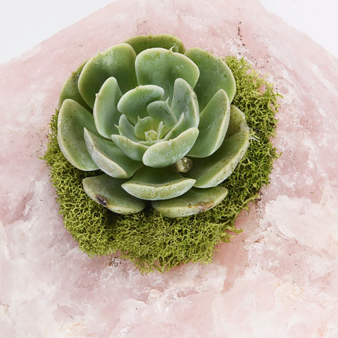 The Rose Quartz Garden comes with a succulent or a cactus plant. Rose Quartz encourages confidence and self-love by linking us to the heart of Mother Earth. The crystal brings energetic awareness to the heart chakra. It allows us to be open to the energy of healing and growth. It teaches us how to give and receive pure love.